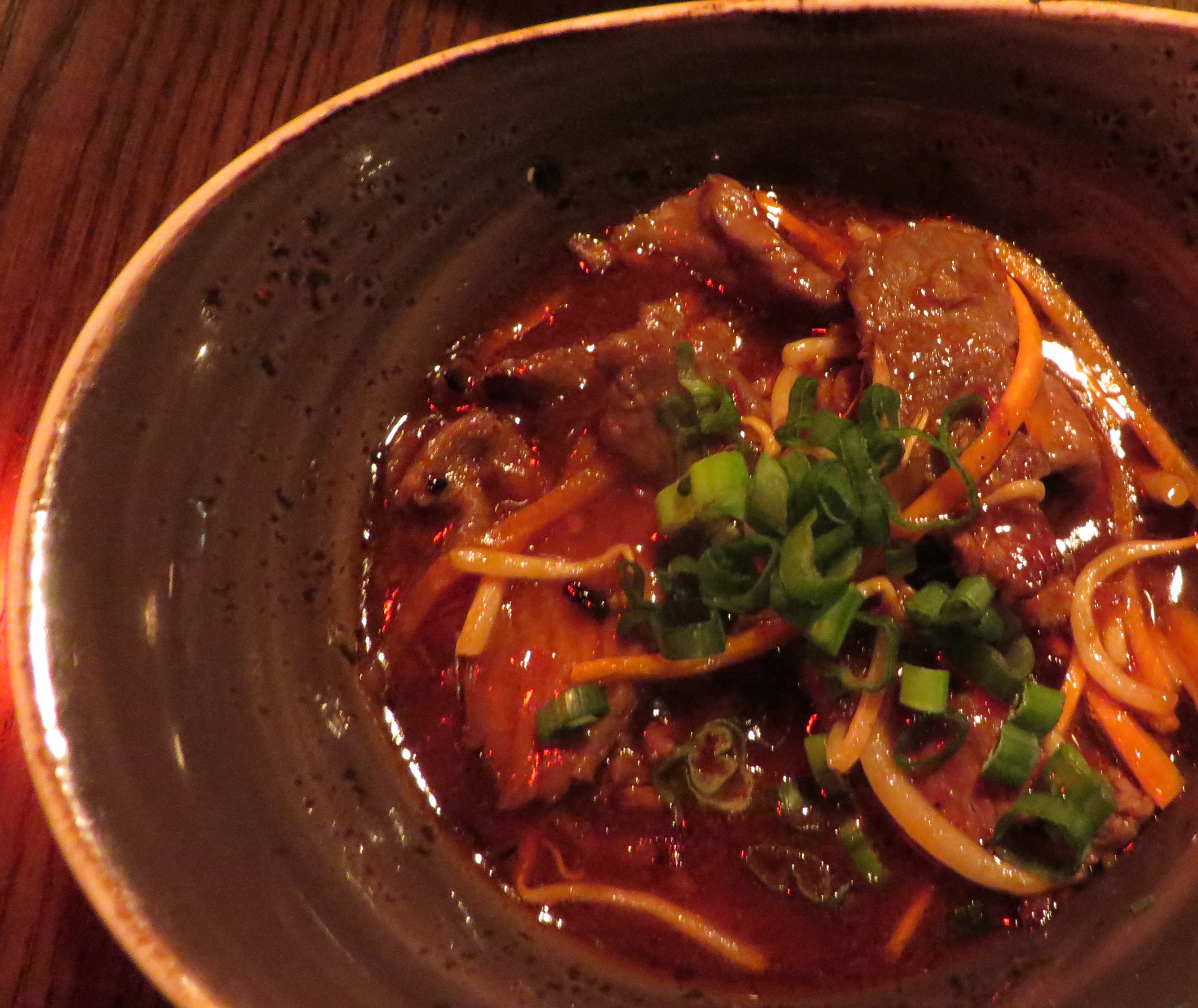 Our festive four-course prix-fixe dinner started Hot & Sour Soup, spiced with sambal sauce, and Eggrolls with pickled veggies. The next two excellent dishes arrived together, Shrimp Fried Rice and Kung Pao Beef.