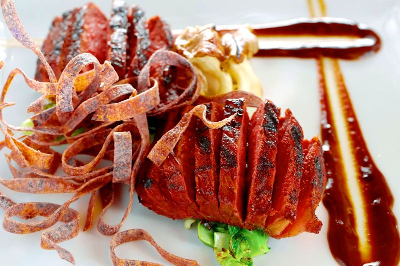 Hardy steak lovers will appreciate the high quality A5 Dry Aged Wagyu NY Strip entrée. The richly flavored and tender dry aged Wagyu steak arrives sliced over shaved Brussel sprouts, Pink Oyster mushrooms and Sake Shiitake mushrooms, which are caramelized in a black garlic reduction glaze. This over-the-top dish is, then, finished with a topping of crunchy Blue potatoes ribbon strips.
