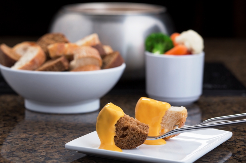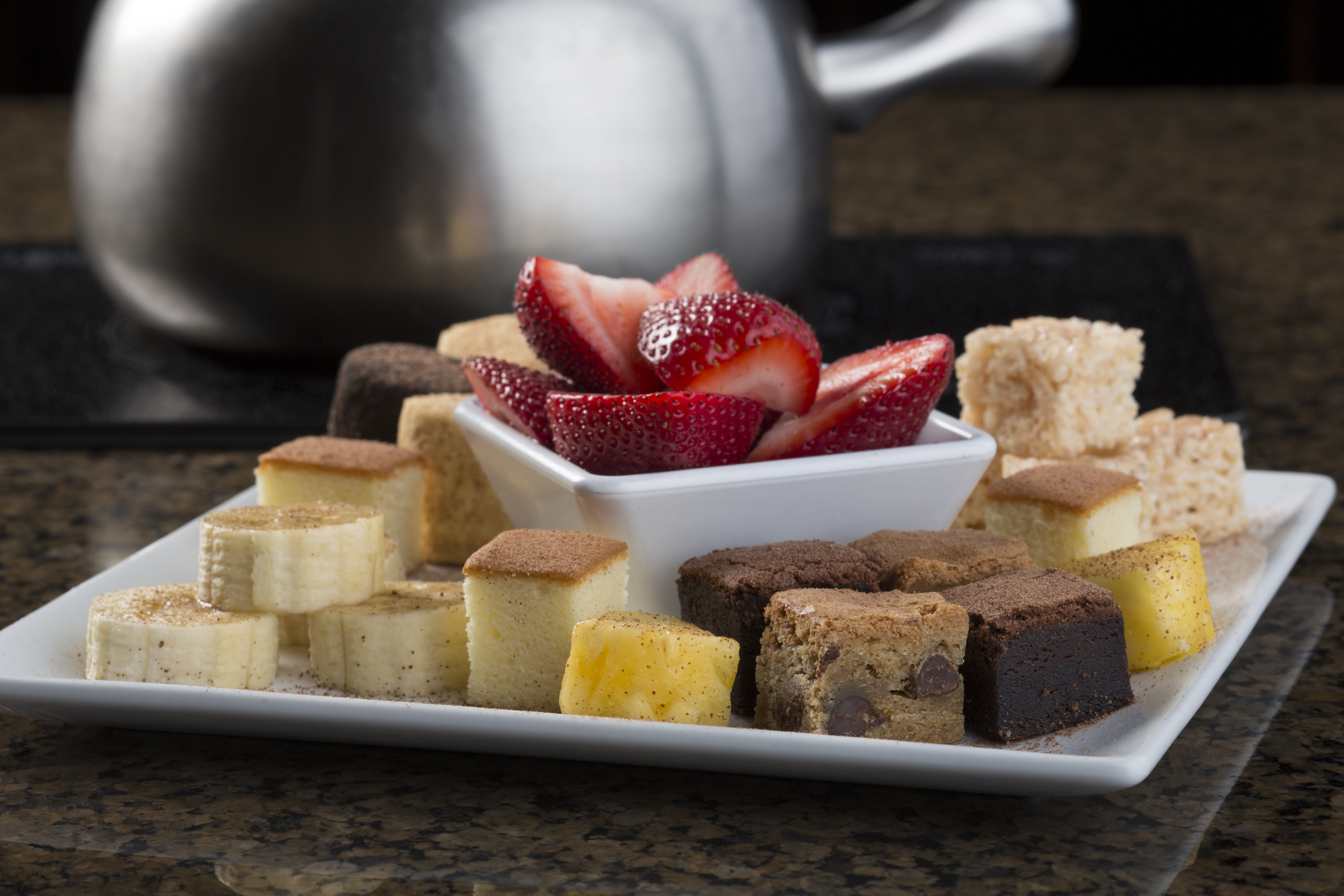For the main course, guests select uncooked proteins of their choice, which they will cook in the fondue pot in seasoned broths or canola oil. To accompany the meats and seafood are raw vegetables, such as mushrooms and potatoes, and three signature condiments. These sauces are Plum Ginger, Yogurt Curry, and Teriyaki.
